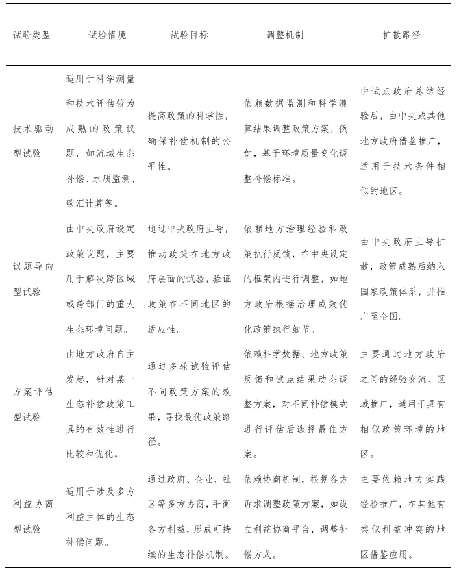 通过分析生态补偿领域的四项试点可以看到,不同的试验类型在试验情境、试验目标、政策调整机制、政策扩散路径等方面表现出较大的差异,如表1所示。一是试验情境的差异决定了不同类型的适用范围。技术驱动型试验适用于数据可测量、环境质量可量化的领域,议题导向型试验聚焦中央政府设定的特定区域生态问题,方案评估型试验用于比较和优化某一生态补偿工具,利益协商型试验常见于多方利益主体的补偿问题。二是试验目标导向各异。技术驱动型强调科学性与公平性,议题导向型强调验证政策适应性,方案评估型注重多轮比较找到最优方案,利益协商型注重平衡各方利益,推动形成可持续机制。三是政策调整方式决定了试验的灵活性。技术驱动型依赖数据监测和科学测算,议题导向型依赖地方治理经验和执行反馈,方案评估型强调基于数据和反馈的动态评估,利益协商型则根据不同主体诉求不断修订方案。四是政策扩散路径的差异影响了经验推广。技术驱动型多在技术条件相似地区推广,议题导向型在中央主导下纳入国家政策并扩散,方案评估型依靠地方经验交流和区域性推广,利益协商型依赖地方实践,在类似利益冲突地区被借鉴。