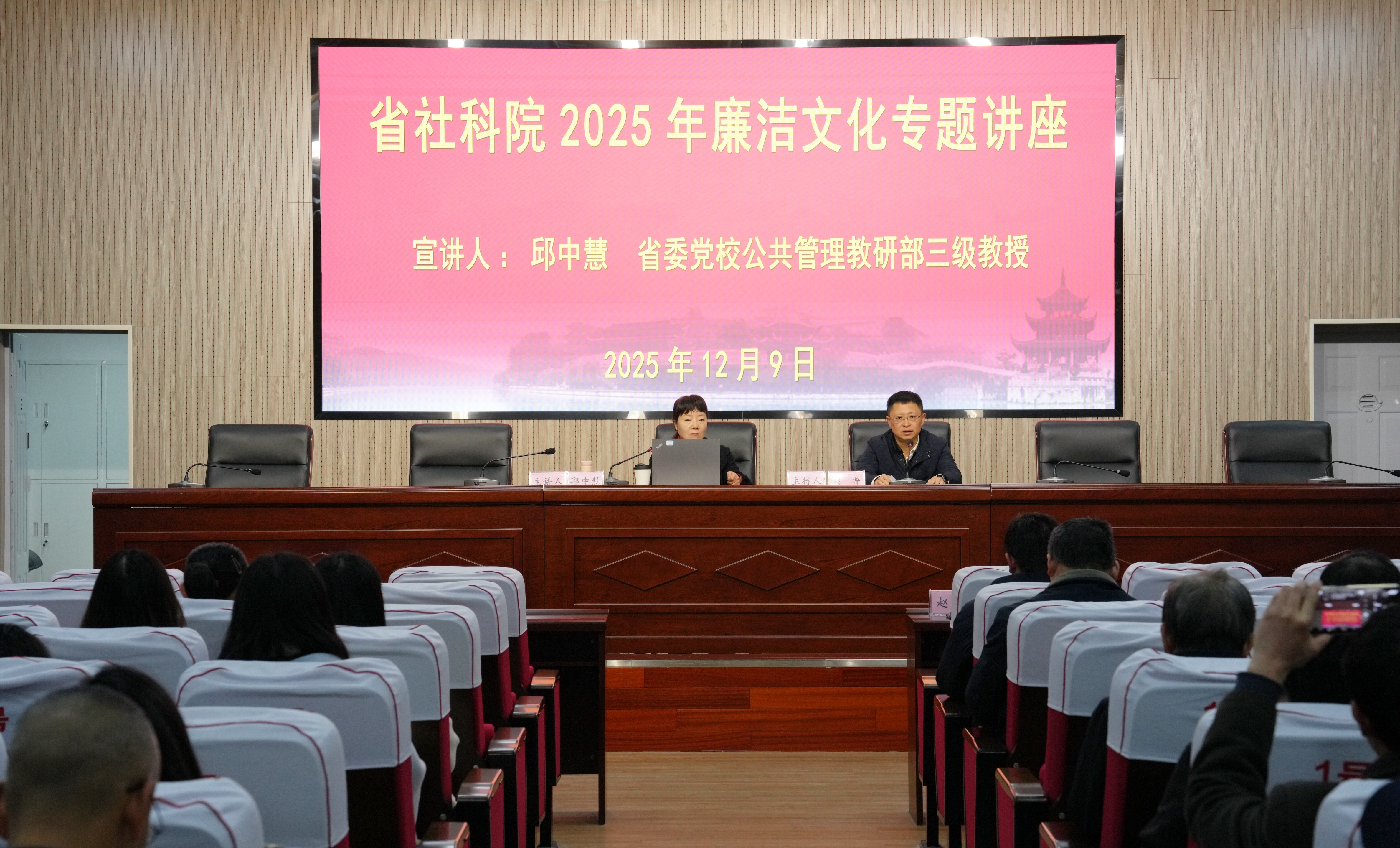 2025年12月9日,贵州省社会科学院邀请中共贵州省委党校公共管理教研部邱中慧教授作“习近平总书记关于注重家庭家教家风的重要论述”专题讲座,院党委常委、副院长赵普主持,院全体干部职工参加。