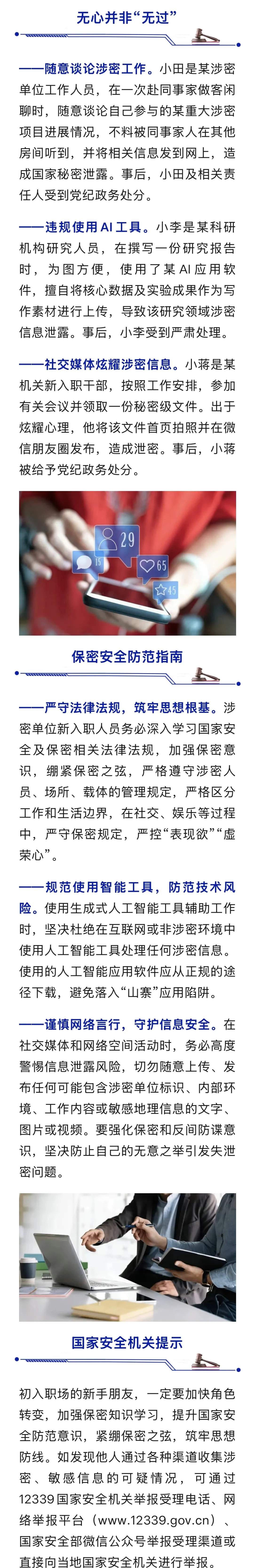 又是一年入职季,“萌新”勇闯职场,有时因为一些无心之举,上演着一场场职场“小白”历险记。国家安全机关通报几起典型案例。