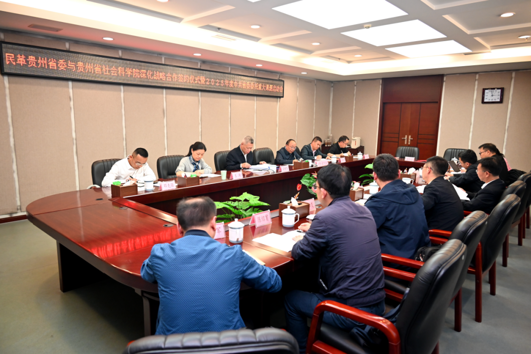 5月6日下午,民革贵州省委与贵州省社会科学院深化战略合作签约仪式暨2025年度中共贵州省委委托重大调研课题启动会在贵阳举行,贵州省人大常委会副主任、民革贵州省委主委王世杰出席并讲话。中共贵州省社会科学院党委书记黄朝椿,党委常委、副院长赵普;民革贵州省委专职副主委、省政协副秘书长(兼)邓文淼,民革贵州省委秘书长王湖出席。