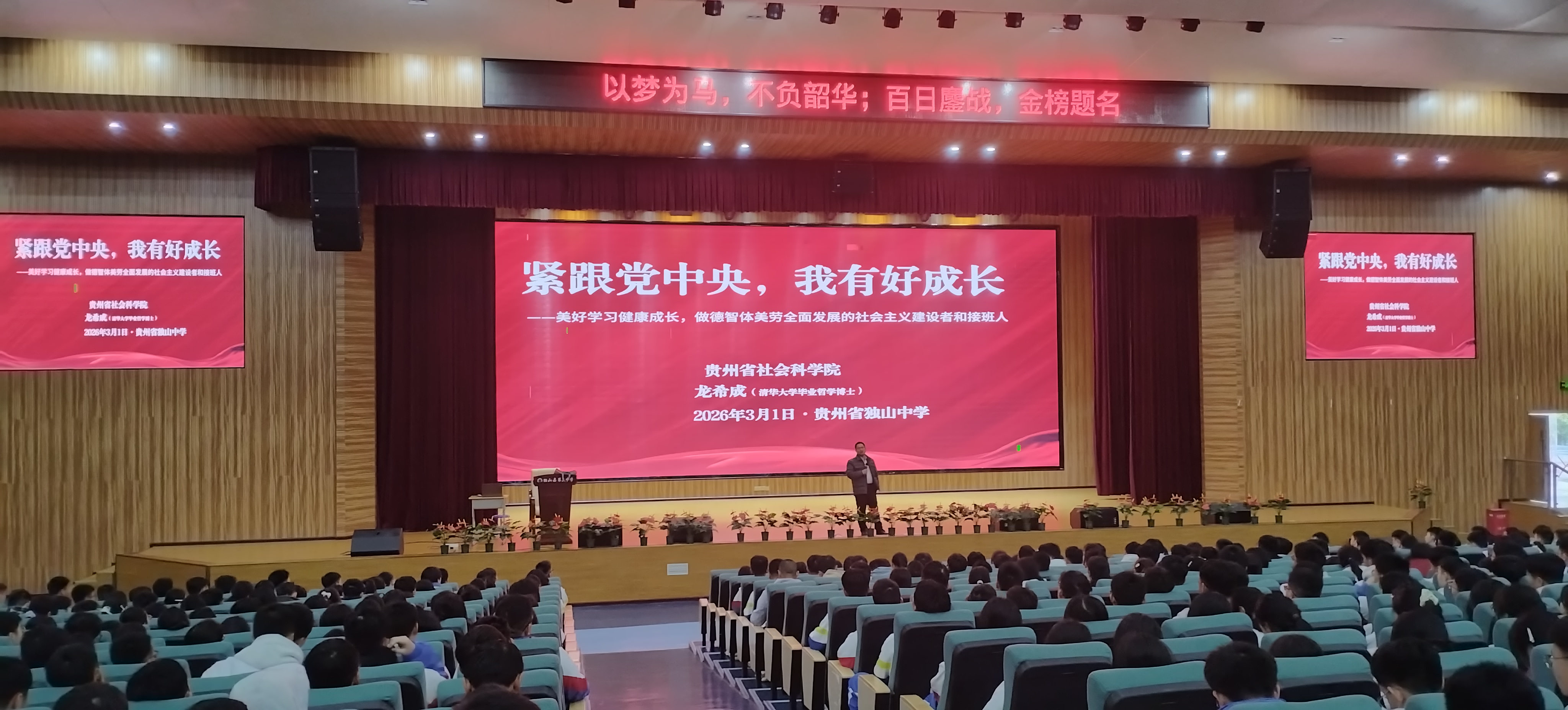 为学习贯彻习近平总书记在二〇二六年春节团拜会上重要讲话精神,落实省《政府工作报告》“优化提升教育水平”“促进学生身心健康”等要求,省社科院社会主义核心价值观研究中心主任龙希成博士应邀到贵州省独山中学,以“紧跟党中央,我有好成长”为题,分别于2月28日和3月1日作演讲两场,为高三年级25个班和初三年级2个班共1300多名学生提供健康成长观念和美好学习方法服务,讲后跟同学们问答互动,激励学生做德智体美劳全面发展的社会主义建设者和接班人。